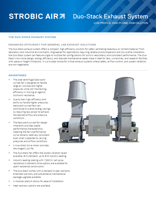 The Duo-Stack Exhaust System is for enhanced efficiency for laboratory exhaust applications. The Duo-Stack is ideal for exhaust in laboratories, hospitals, universities, and schools. It is a great choice for high static or high temperature applications. It is a highly efficient system, featuring a backward-curved blade design that minimizes dust and debris accumulation, reduces noise levels, and maximizes energy efficiency for optimal performance and longevity.